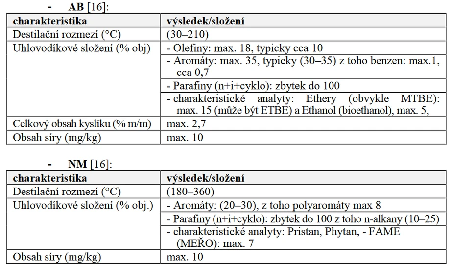 Obecně lze konstatovat, že vypařováním vzorku, degradačními změnami, přítomností zplodin hoření se charakteristické profily obou paliv mění. Interpretace chromatogramů proto vyžaduje zkušenost, viz obr. č. 1 s tab. č. 1 a pro porovnání obr. č. 2 a tab. č. 2.