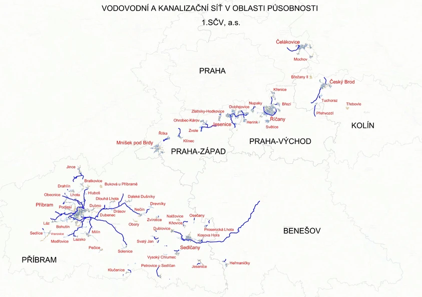 Společnost 1.SčV je významným zaměstnavatelem především na Příbramsku, v Praze – západ a Praze – východ. V současné době má společnost 187 zaměstnanců a zabývá se výrobou a distribucí pitné vody, odváděním a čištěním odpadních vod, prováděním stavebních děl a poskytováním služeb v oblasti vodního hospodářství. Společnost zajišťuje výrobu a distribuci pitné vody pro celkem 104 921 obyvatel v okresech Příbram, Sedlčany, Mníšek pod Brdy, Praha západ a Praha východ. 1. SčV, a.s., je členem skupiny Veolia Česká republika.